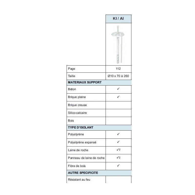 Chevilles d’isolation KI Multi matériaux à expansion courte.