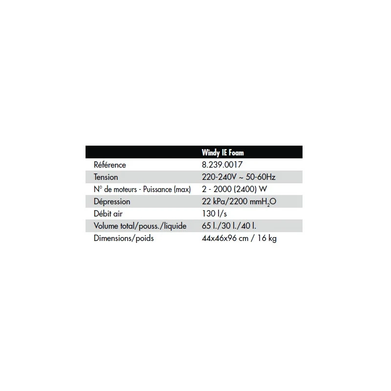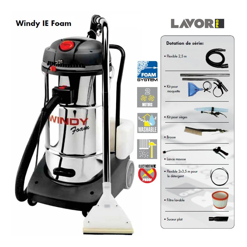 – L’aspirateur eau et poussières / injecteur-extracteur Lavor WINDY IE FOAM a une puissance de 2400 W max. avec une aspiration d’air de 130 l/s