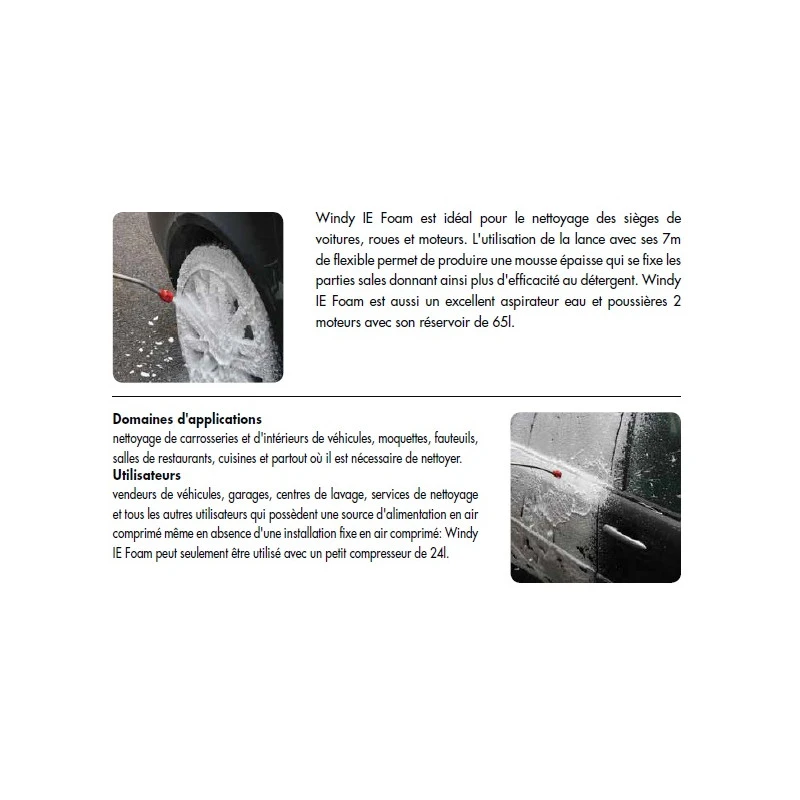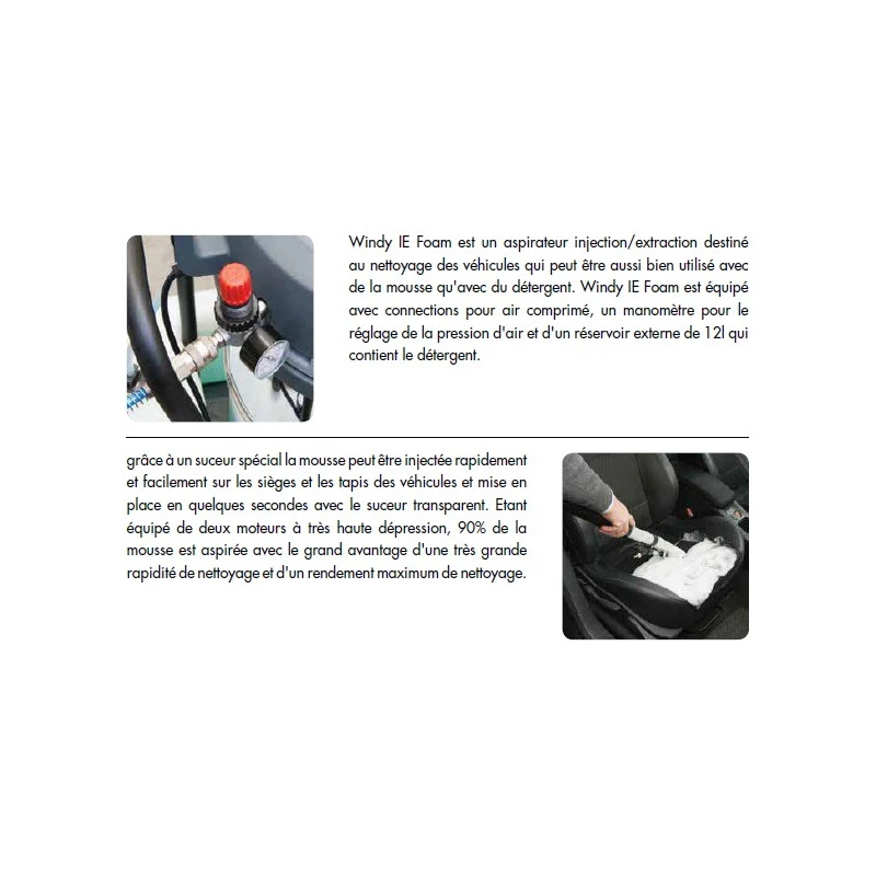 Windy IE Foam est un aspirateur injection/extraction destiné au nettoyage des véhicules qui peut être aussi bien utilisé avec de la mousse qu’avec du détergent. Windy IE Foam est équipé avec connections pour air comprimé, un manomètre pour le réglage de la pression d’air et d’un réservoir externe de 12l qui contient le détergent. Grâce à un suceur spécial la mousse peut être injectée rapidement et facilement sur les sièges et les tapis des véhicules et mise en place en quelques secondes avec le suceur transparent. Etant équipé de deux moteurs à très haute dépression, 90% de la mousse est aspirée avec le grand avantage d’une très grande rapidité de nettoyage et d’un rendement maximum de nettoyage. Windy IE Foam est idéal pour le nettoyage des sièges de voitures, roues et moteurs. L’utilisation de la lance avec ses 7m de flexible permet de produire une mousse épaisse qui se fixe les parties sales donnant ainsi plus d’efficacité au détergent. Windy IE Foam est aussi un excellent aspirateur eau et poussières 2 moteurs avec son réservoir de 65 l.