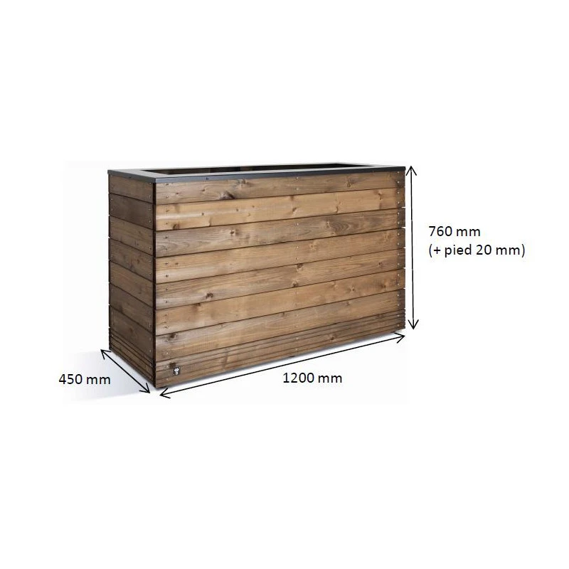 Traitement – finition : traitement autoclave classe 3 teinté brun (bac) / thermolaqué noir (couvercle)