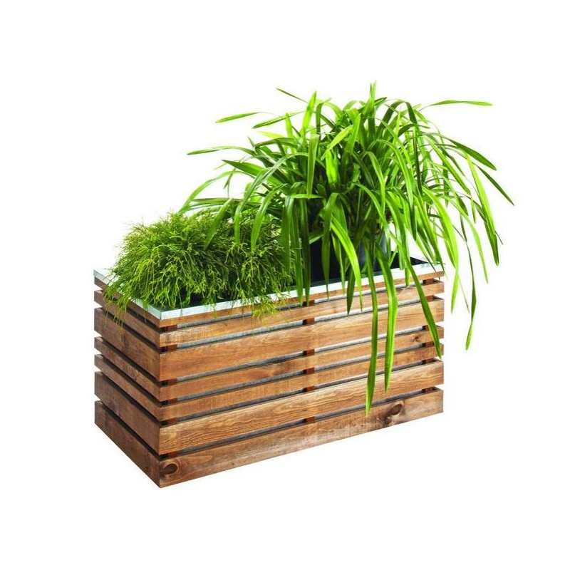 Un jeu de lignes extrêmement graphique dévoilant au travers des lames en bois l’acier du bac intérieur….un mix matière réussi très contemporain. Sculptural!