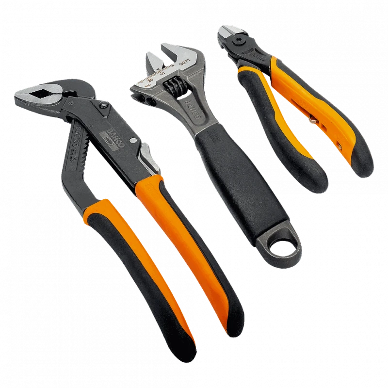 – Le jeu comprend : pince coupante diagonale 2101G-160, pince multiprise 8224 et clé à molette 9071
