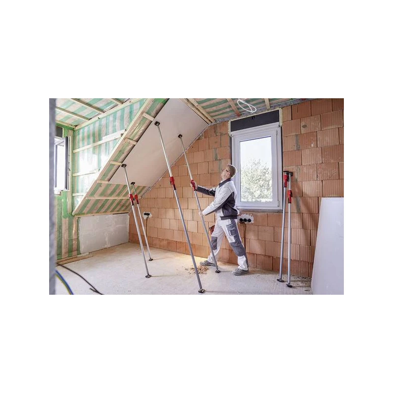 – Grâce à la fixation en trois étapes : Pour prérégler le support de plafond, il suffit d’actionner la touche de déverrouillage et de sortir le tuyau intérieur télescopique à la longueur souhaitée. Le réglage fin est réalisé en actionnant le levier de pompe jusqu’à ce que la plaque de butée du
