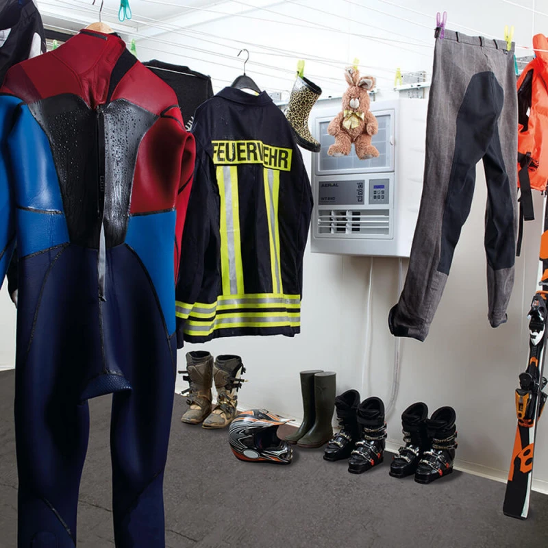 Le séchage à l’aide d’un ou plusieurs sèche-linge classiques est très énergivore. Pour économiser de l’énergie, le linge peut être séché à l’extérieur à l’air frais pendant l’été. Mais que faire par mauvais temps ou en hiver ? Une buanderie équipée d’un sèche-linge AERIAL constitue une alternative fiable et respectueuse de l’environnement. Elle peut être utilisée comme déshumidificateur d’air pour garder les pièces constamment sèches et éviter les moisissures et les dommages matériels, ainsi que les problèmes de santé dus à une humidité excessive.