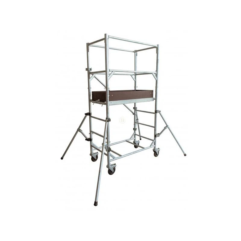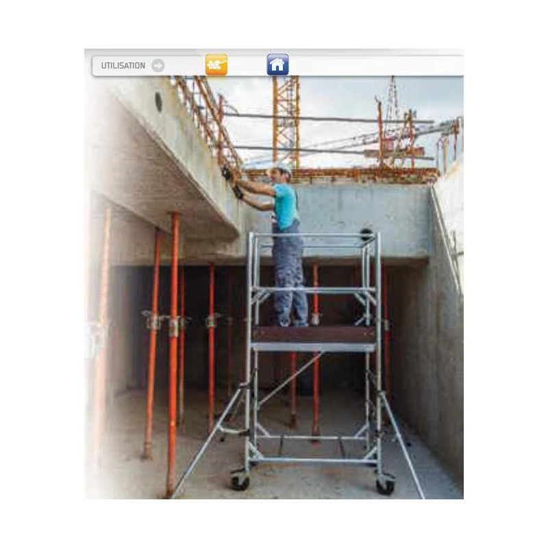 – Il est simple à mettre en oeuvre, montage en sécurité MDS 2, 2 minutes de montage: base monobloc soudée rigide, stabilisateurs avec système de fixation ergobloc et garde-corps monobloc diagonalisant.