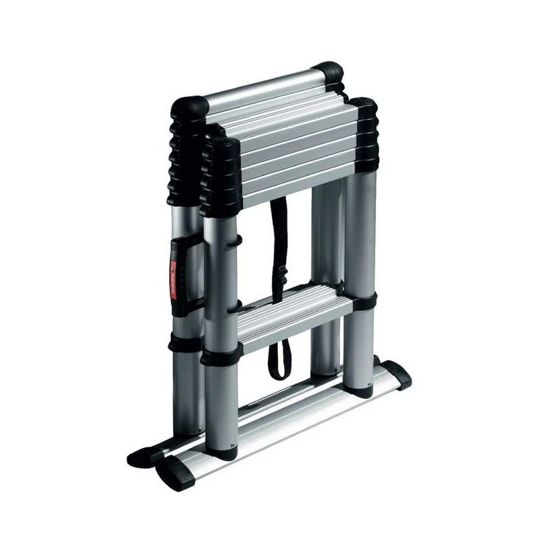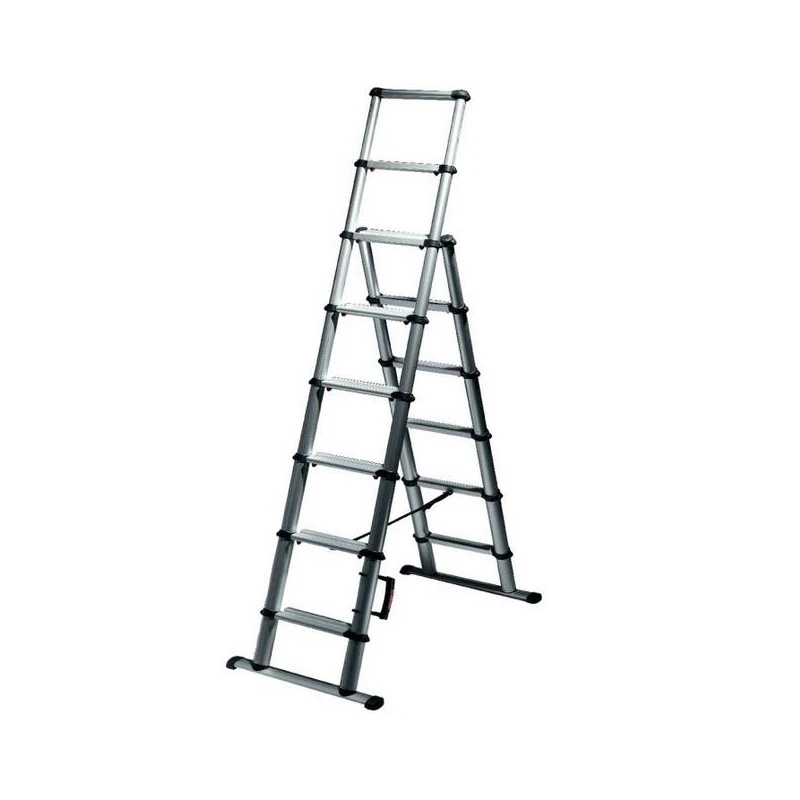 L’échelle transformable fonctionne comme un escabeau indépendant, mais possède deux barreaux supplémentaires en guise d’appui pour les jambes qui permet de se tenir fermement et de travailler en hauteur.