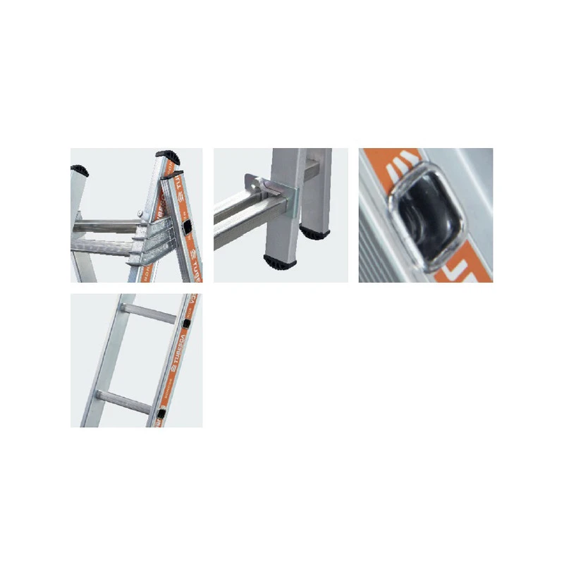 L’échelle Pronor transformable 2 plans aluminium dispose d’une base évasée, d’articulations en fonderie d’alu et d’un bras anti-écartement en acier garantissant ainsi fiabilité et confort. Avec des modèles de 2×7 à 2×14 échelons, elle permet une hauteur d’accès pouvant aller jusqu’à 8m07 et 4 positions d’utilisation. Elle est conforme à la norme EN 131, au décret 96333 et au label NF. Les modèles 12 et 14 échelons sont équipés de sangles et non pas de bras de sécurité.