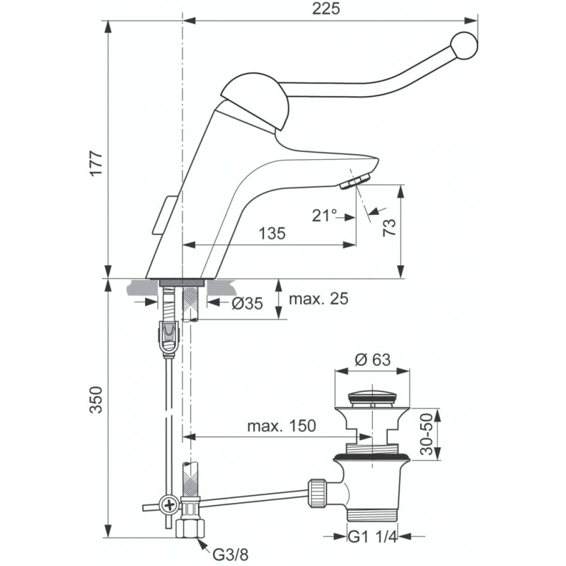 Ideal Standard – Mitigeur lavabo monotrou avec tirette et vidage bonde métal H 177 mm chrome – Okyris Blue Clinic