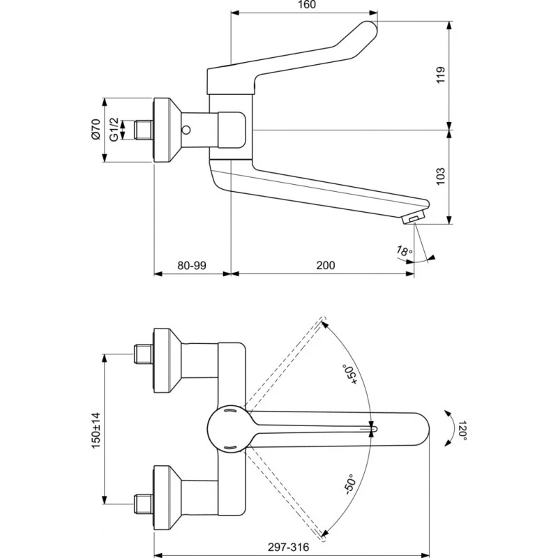 Ideal Standard – Mitigeur mural L 160 mm chromé avec raccords stop/purge – Okyris Pro