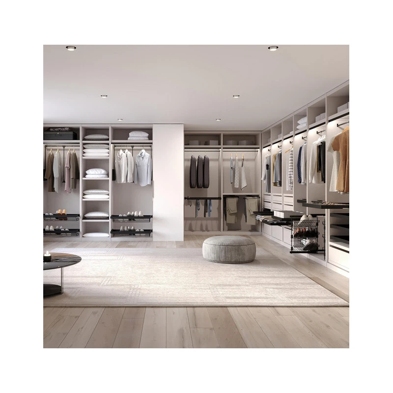 Le Kit contient un panier métallique et un cadre coulissant réglable pour l’adapter à l’intérieur de l’armoire. L’étagère pour accessoires d’armoire est réalisée avec un style minimaliste soigné, qui se distingue par sa finition texturée en gris pierre ou noir, qui est la dernière tendance en matière de design d’armoire dans les chambres et les dressings. Il rend le rangement des vêtements plus confortable grâce à ses glissières à fermeture douce et à extraction partielle, qui permettent au cadre de s’ouvrir et de se fermer lentement et silencieusement pour éviter les chocs, avec des pièces d’embellissement pour cacher les glissières.