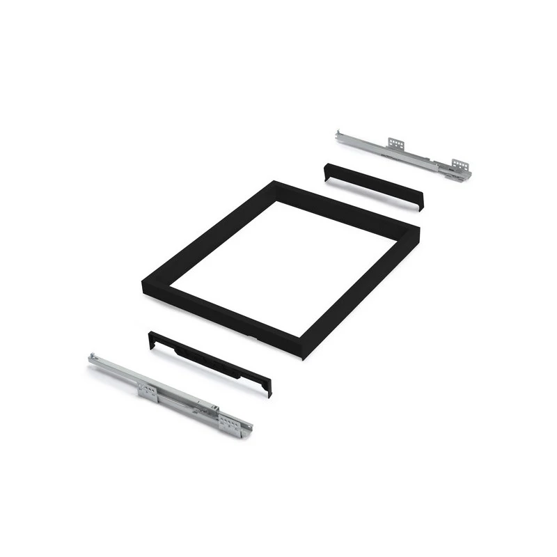 - Cadre avec guides à fermeture douce et extraction partielle. Fabriqué en aluminium et en plastique avec une finition peinte texturée noire.