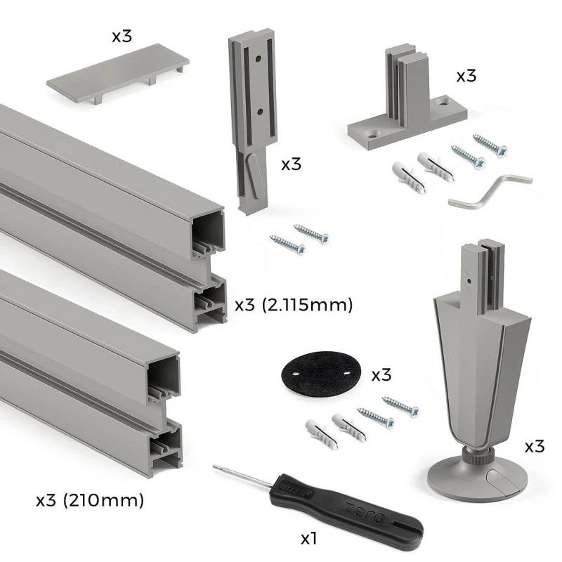 Kit de profilés Zero pour réaliser une composition avec 1 ou 2 ouvertures, comprend des profilés Zéro de longueur 2,115 mm et 210 mm ainsi que tous les accessoires nécessaires pour le montage avec fixation au sol et au mur. Cette composition comprend les niveleurs circulaires.