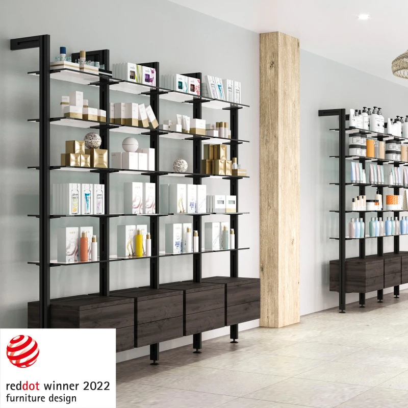 Profils et accessoires pour combiner les accessoires entre eux pour créer des étagères modulaires. Les profils sont fabriqués en aluminium et les raccords et supports en Zamak, le tout avec une finition peinture noire texturée (RAL 9005). Grâce à sa simplicité et à son design, vous pourrez adapter le système Zero rapidement à tout type d’environnement : maison, dressing, bureau et boutiques. Vous pourrez combiner différents éléments pour créer votre composition idéale : étagères en bois, modules de verre, petites armoires et tringles.