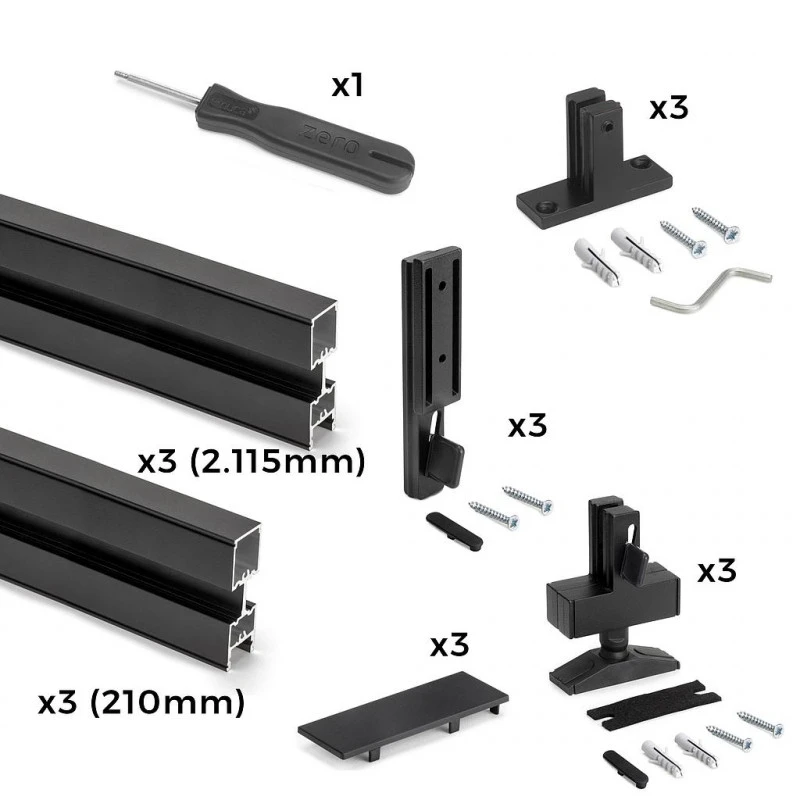 - Composants : 3 Profilés de 2,115 mm, 3 profilés de 210 mm, 3 niveleurs, 3 raccords profilés, 3 fixations murales, 12 vis Ø4×30, 12 caches Ø6×30, 6 vis Ø3,5×25, 3 caches décoratifs profilé, 6 caches accessoires, 1 clé allen ainsi que les instructions de montage