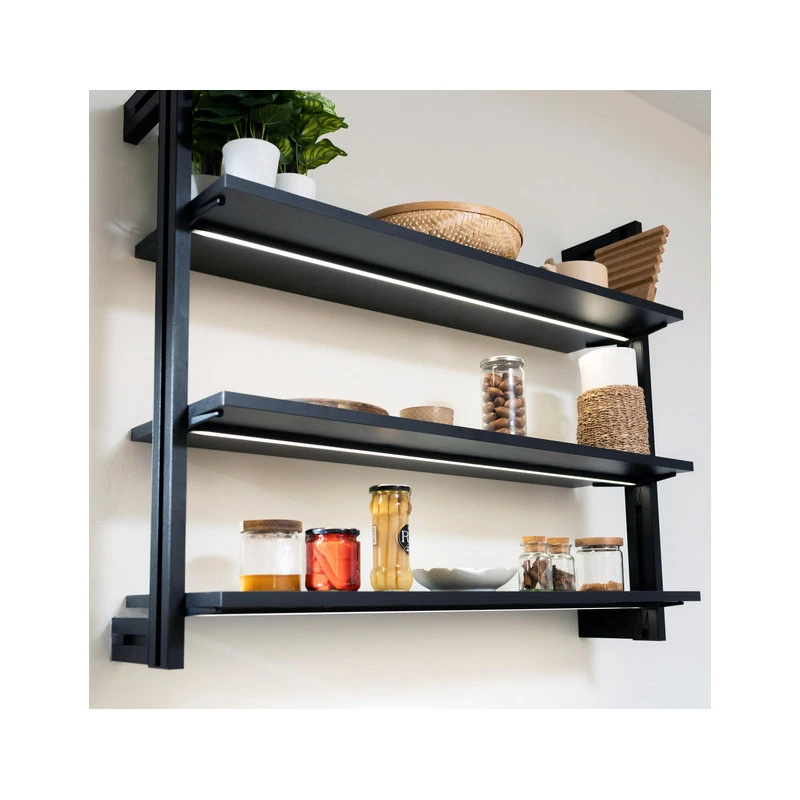 - Kit complet de profilés, accessoires de fixation et 3 supports pour étagères en bois.