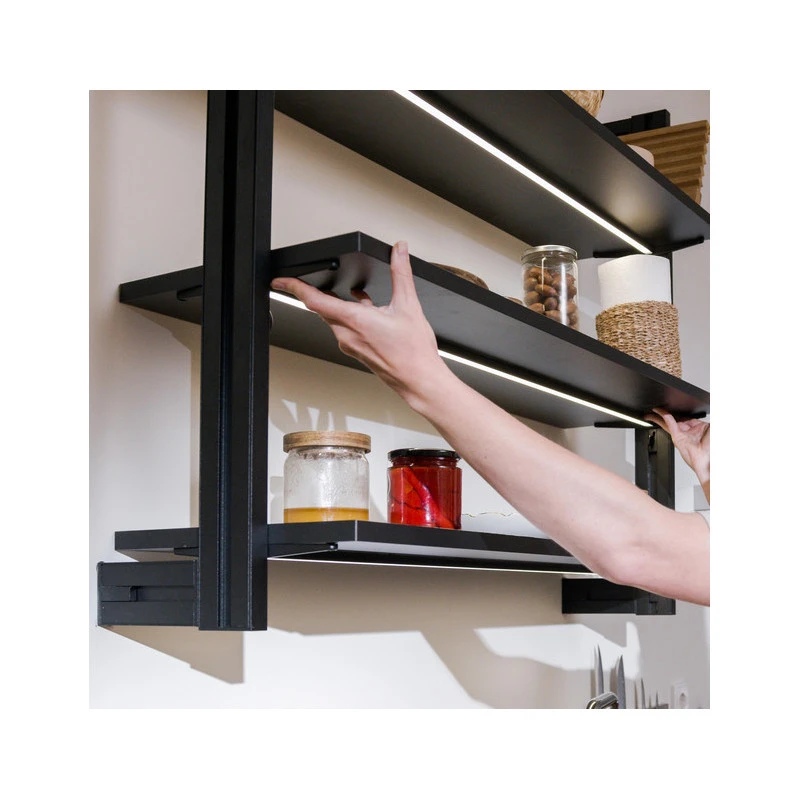 Les profils horizontaux de la structure sont conçus pour réaliser des étagères en bois d’une profondeur de 330 mm et la hauteur maximale de la composition est de 900 mm.