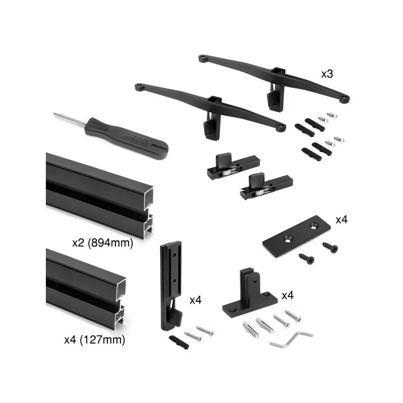 Le kit comprend les profils Zero nécessaires à la réalisation de la composition de 900 mm et 127 mm, les éléments de fixation, les joints, 3 jeux de supports pour étagères en bois et un outil pour le réglage en hauteur ou le démontage des accessoires Zero.