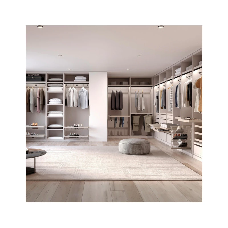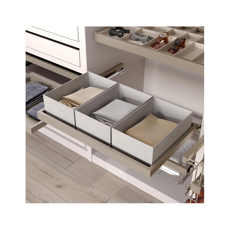 Kit composé d’un plateau avec des séparateurs et d’un cadre avec des glissières à largeur réglable. L’étagère est réalisée avec un style minimaliste soigné, qui se distingue par sa finition texturée en gris pierre ou en noir, qui est la dernière tendance dans la conception des armoires dans les chambres et les dressings. Il rend le rangement des vêtements plus confortable grâce à ses glissières à fermeture douce et à extraction partielle, qui permettent d’ouvrir et de fermer le cadre lentement et silencieusement pour éviter les chocs, avec des pièces de garniture pour cacher les glissières.