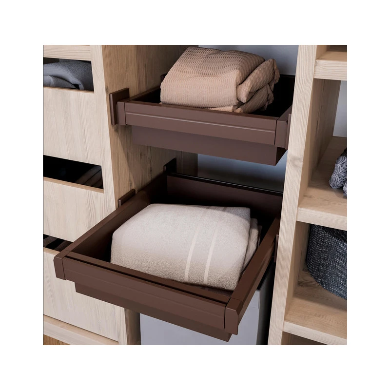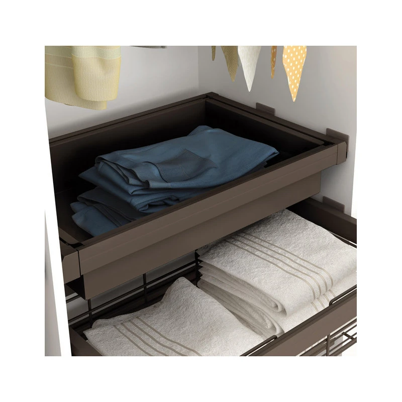 Le Kit contient un tiroir métallique et un cadre coulissant réglable pour l’adapter à l’intérieur de l’armoire. La structure est équipée avec des coulisses invisibles à sortie totale et fermeture amortie, et d’un système de clipsage automatique et rapide pour son installation. Le cadre est fabriqué en aluminium finition couleur moka et le tiroir en acier finition en couleur moka.