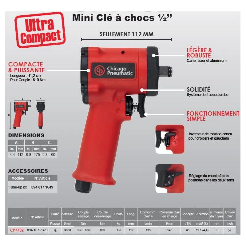 Chicago Pneumatic – Mini Clé à chocs 1/2″ compacte en métal 610 Nm – CP7732