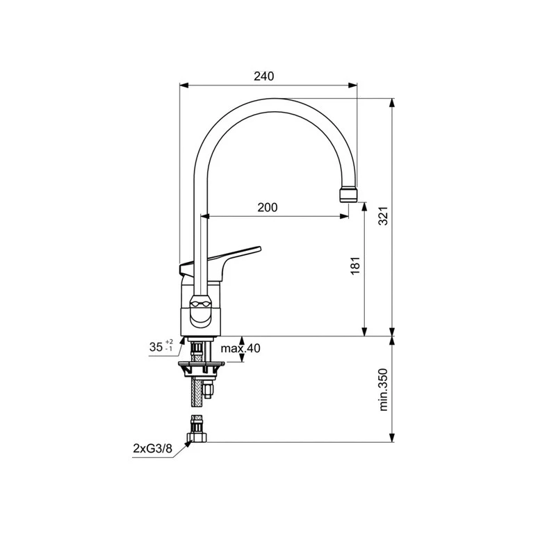 Hauteur sous aérateur 181 mm. Hauteur totale 321 mm. Projection 200 mm
