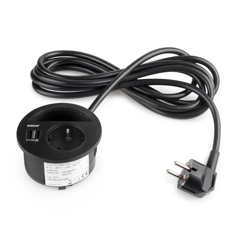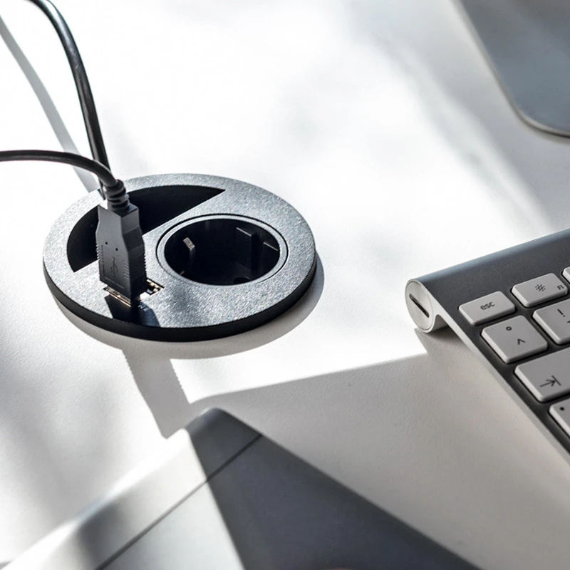 Base multiprise avec passe-câbles idéale pour les meubles de bureau et de maison. Elle est conçue pour avoir toujours à portée de main une prise de courant, deux connecteurs USB et tous les câbles dont vous avez besoin.