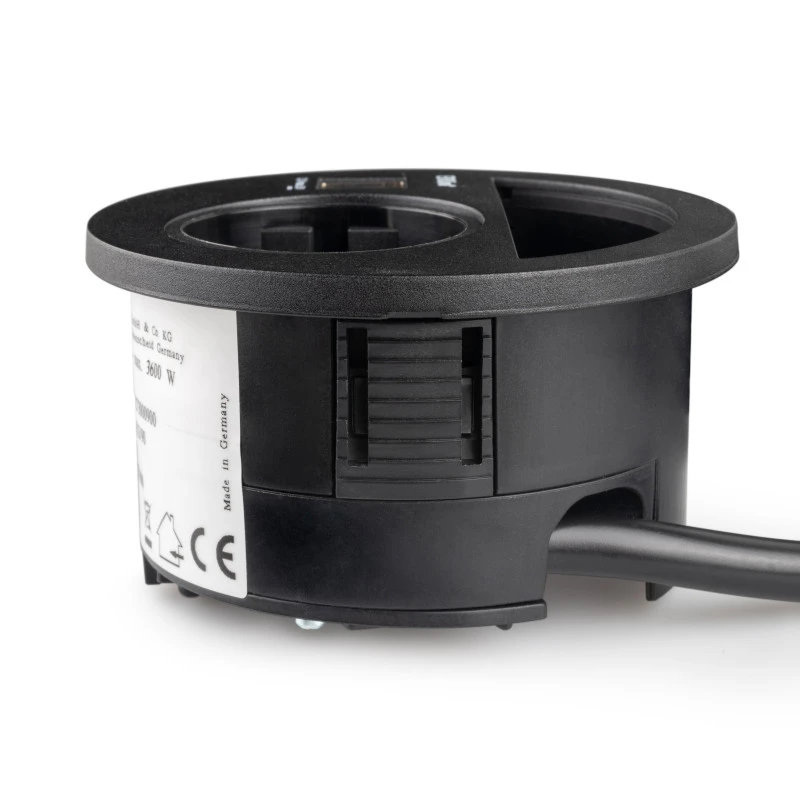 - Connecteur et passe-fil pour encastrement dans les meubles de bureau et de maison, avec sécurité enfant intégrée.