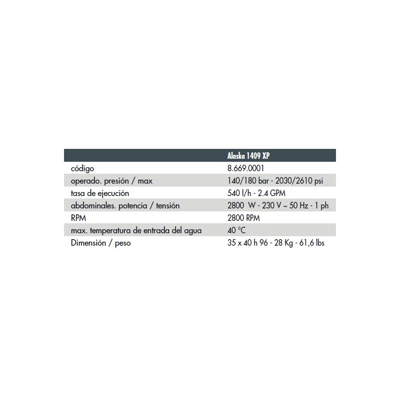 – Le nettoyeur haute pression Lavor Pro Alaska 1409 XP est Ă©quipĂ© d’un moteur de 2800 W permettant d’obtenir une pression maximale de 180 bars avec un dĂ©bit d’eau maximum de 540 L/h.