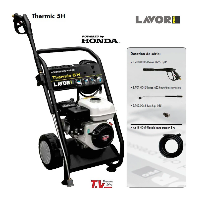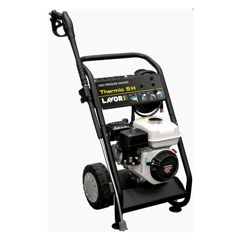 – Le nettoyeur haute pression Lavor Pro Thermic 5H est équipé d’un moteur Honda GC 160 5 HP permettant d’obtenir une pression maximale de 160 bars avec un débit d’eau maximum de 570 L/h.