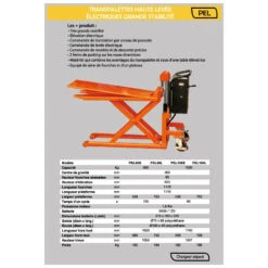 Transpalette Haute Levée électrique Grande Stabilité 500Kg 1115×703 Mm