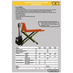 Transpalette Haute Levée électrique 1500 Kg 1100x520mm JE5215