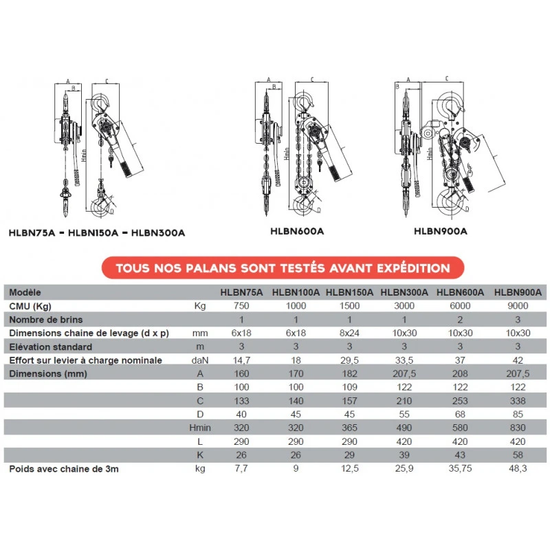 Caractéristiques techniques du palan manuel Stockman HLBN600A :