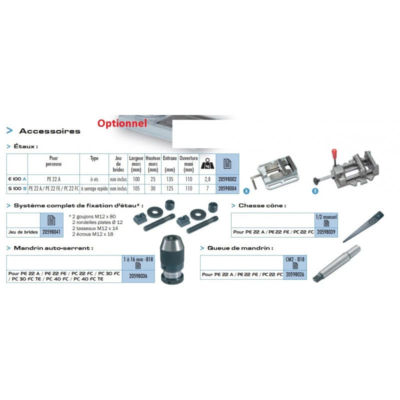 Sidamo Perceuse établi Sidamo PE 22 A est Livrée en série avec mandrin auto-serrant, queue de mandrin, chasse cône, étau à vis et jeu de brides