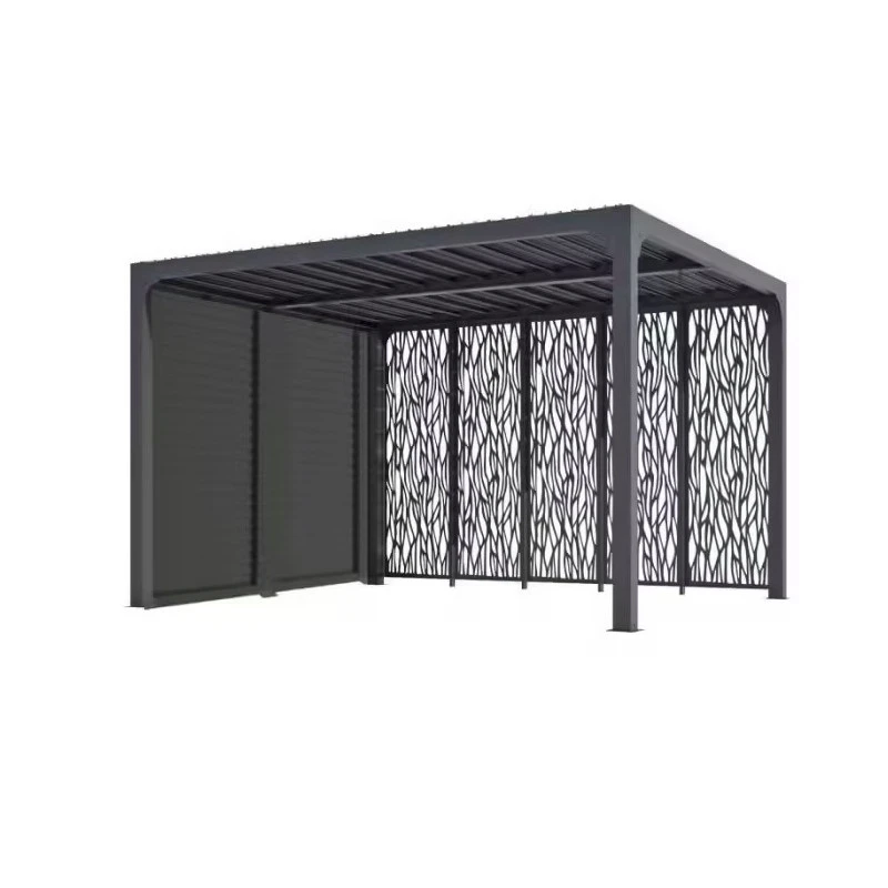Habrita Foresta – Pergola bioclimatique aluminium 10,8m2 avec panneaux moucharabieh gris pour côté 3,60m et ventelles latérales aluminium mobiles pour côté 3m