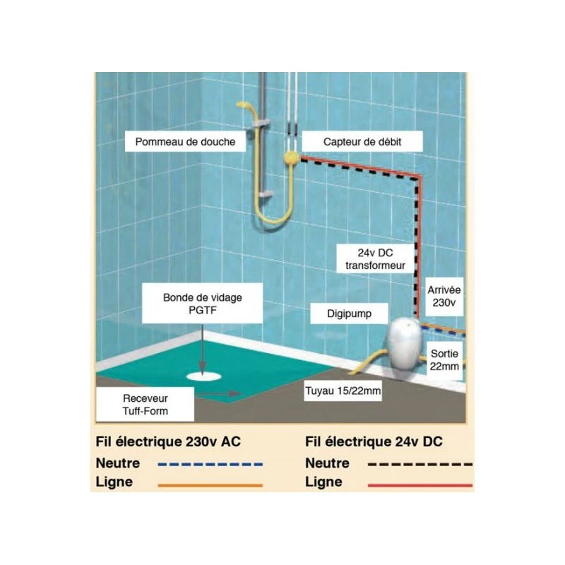 Utilisation comme pompe d’évacuation pour receveur de douche où l’évacuation par gravité n’est pas réalisable.