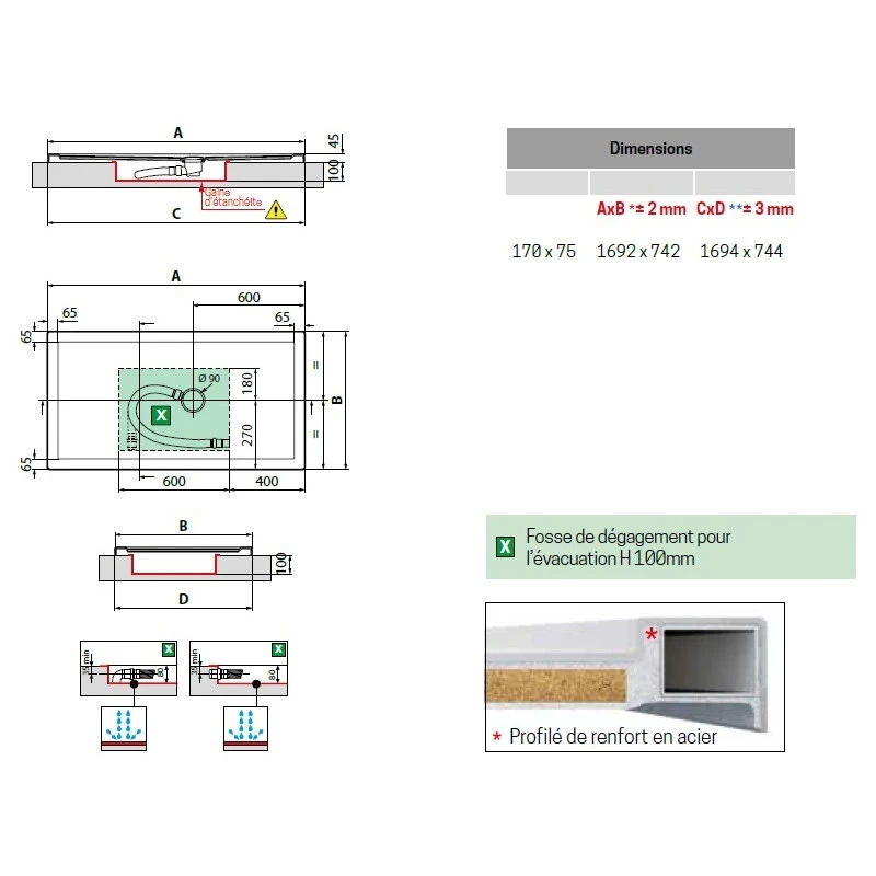 Receveur de douche en acrylique renforcé par des barres en acier