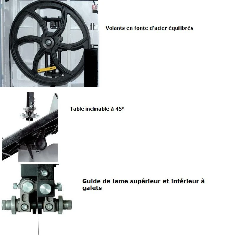 • Guide de lame supérieur monté sur crémaillère et réglable en hauteur par une manivelle.