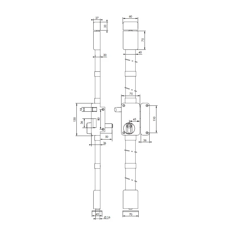 Pênes haut et bas en acier Ø 16 mm sur tringles plates en acier permettant un ajustement très précis à la longueur désirée et ne nécessitant aucune recoupe.
