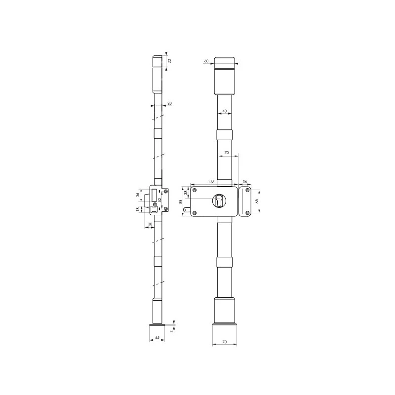 – Pêne haut et bas en acier Ø 16 mm sur tringles plates en acier permettant un ajustement très précis à la longueur désirée et ne nécessitant aucune recoupe