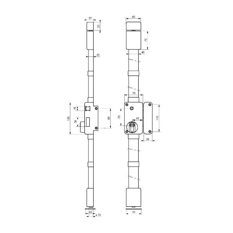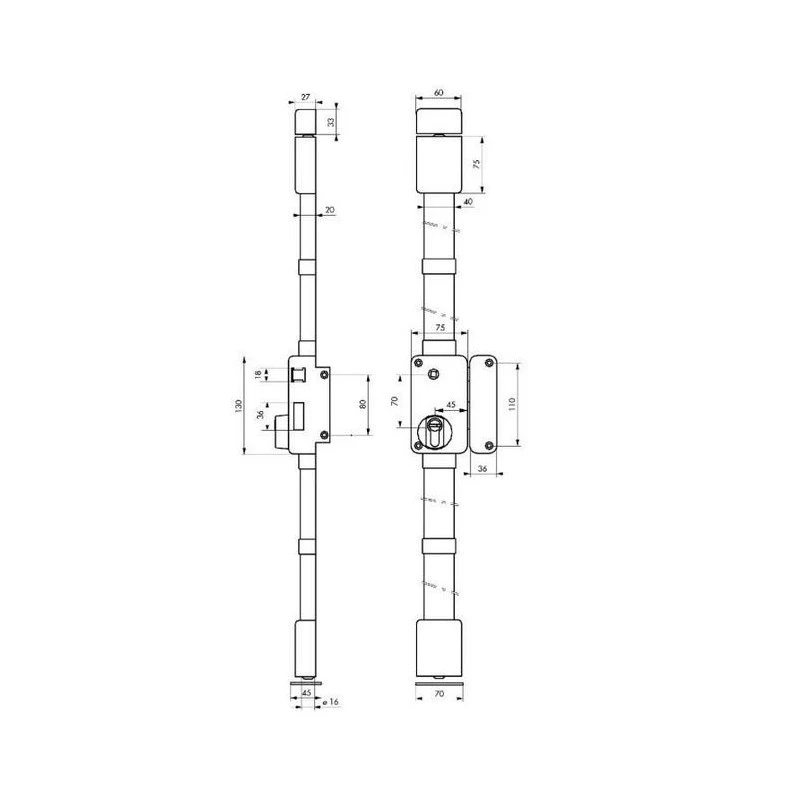 • Pêne haut et bas acier Ø16 mm sur tringle acier télescopique