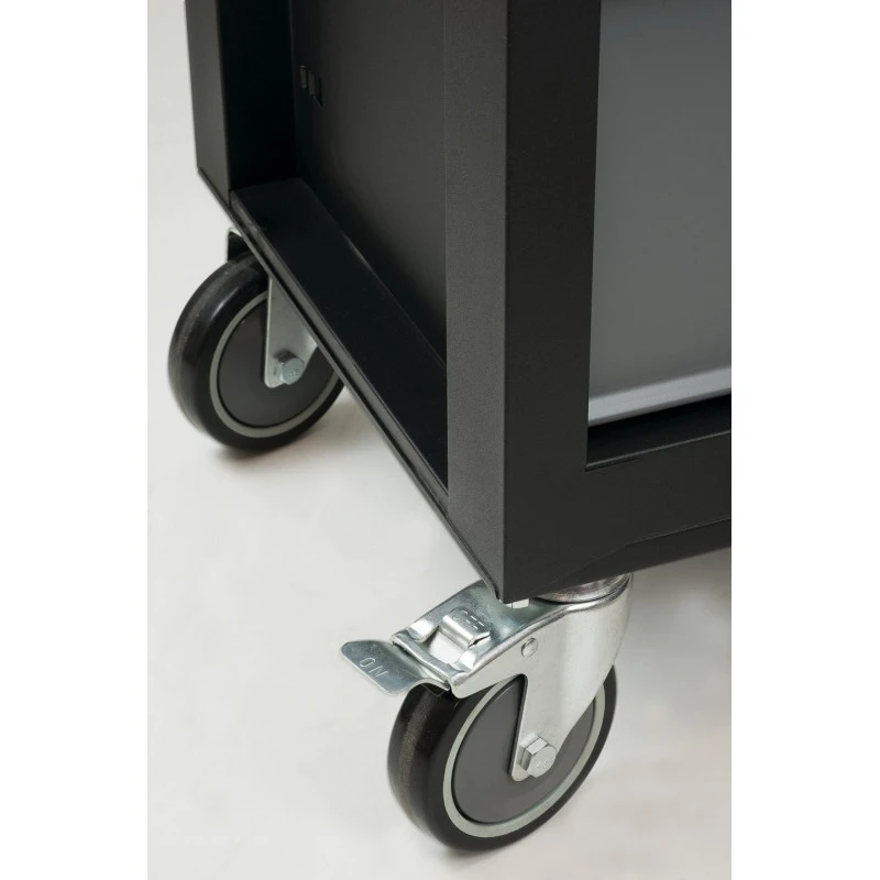 - 2 roues orientables dont 1 à frein et 2 roues fixes (livrées non montées).