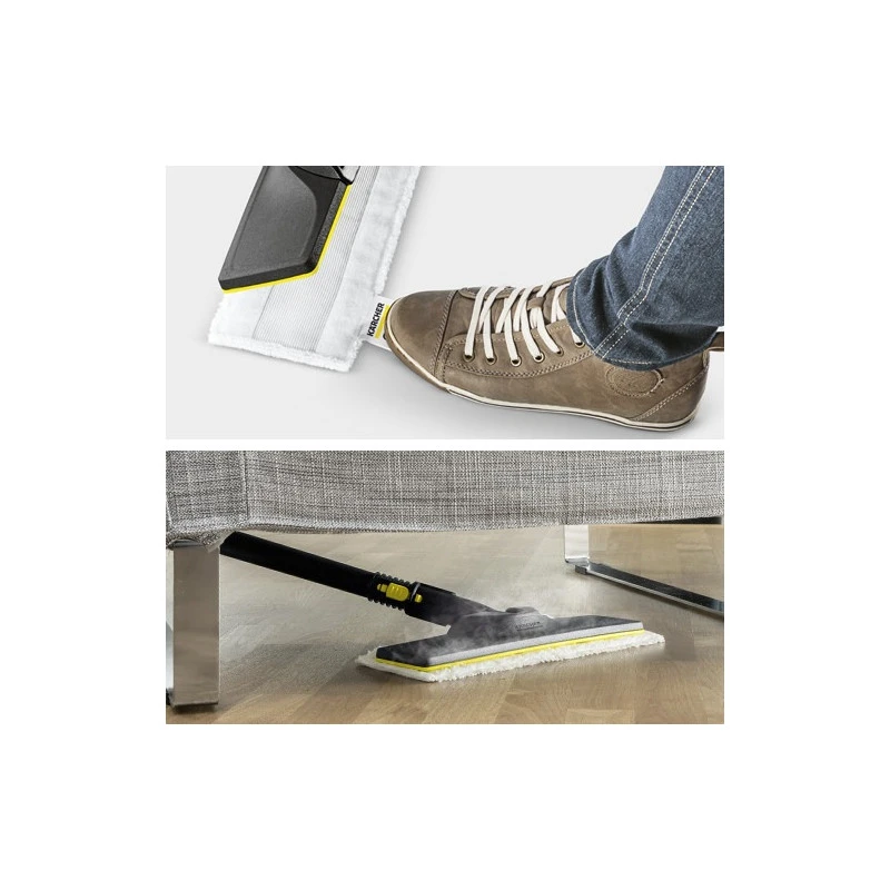 Le suceur de sol EasyFix pour nettoyeur vapeur est fourni avec une serpillère en microfibres adaptée et assure d’excellents résultats de nettoyage sur les sols durs, même dans les coins et sur les rebords. Le système intelligent de velcros permet de fixer rapidement et en toute simplicité la serpillère en microfibres au suceur de sol : il suffit d’appuyer la serpillère sur le suceur de sol EasyFix et c’est fait ! Une fois le nettoyage terminé, la serpillère en microfibres peut être retirée du suceur de sol EasyFix sans toucher la saleté : il suffit pour cela de tirer sur le pied fixé à la serpillère et d’enlever le suceur de sol en le dirigeant vers le haut.