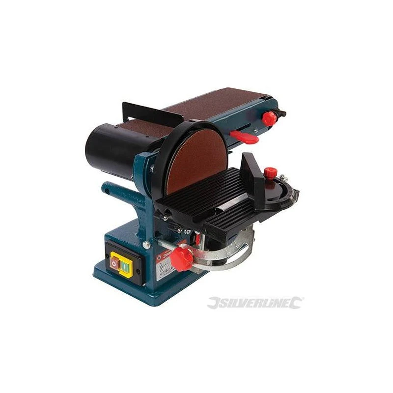 Ponceuse stationnaire associant ponceuse Ă bande et ponceuse Ă disque de 150 mm.