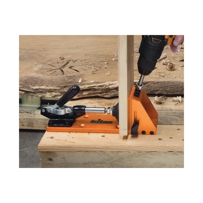 – Fournis : guide de perçage Triton, foret de perçage oblique étagé, bague de profondeur, clé hexagonale, vis, chevilles, serre-joint, embout carré 152 mm, système de fixation et manuel d’instructions.